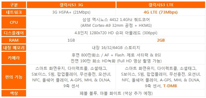 하지만 갤럭시S3 LTE 모델은 3G 모델과 비교해 보면 여전히 스펙상 우위를 보이고 있습니다. 위에 언급한 가용램 (RAM) 과 DMB 탑재가 바로 그것이죠. 최근 들어 DMB 사용이 많이 줄어들고 있기는 하지만 아직도 국내 스마트폰 사용자의 DMB 선호도는 꽤 높은 편이고 하나의 킬러 앱으로 여겨지고 있기 때문에 DMB가 있는 것과 없는 것의 차이는 여전히 존재합니다.