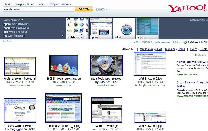 우선 야후 이미지 검색을 살펴보면 사용자 인터페이스가 상당히 편리해졌습니다. 검색창에 "web browser"라는 단어를 넣고 검색하니 아래와 같이 web browser라는 단어가 들어간 추천 검색어 리스트가 내려옵니다. 여기서 원하는 검색어를 선택할수 있어 편리하고 그 옆에는 관련 이미지의 미리보기가 나열되어 있어서 편리하게 원하는 이미지를 찾을수 있습니다. 검색하고자 하는 이미지 크기에 따라 쉽게 원클릭으로 찾을수 있도록 크기별 링크를 제공해 줍니다. (Wallpaper-Large-Medium-Small 순서) 그리고, 광고가 오른편에 위치해 있어 그리 눈에 거슬리지 않는 느낌을 주는것 같습니다.