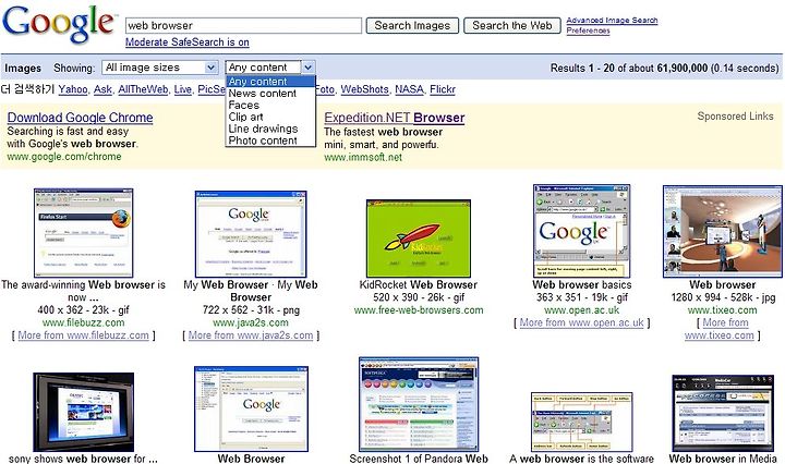 구글 이미지 검색은 아래와 같이 야후보다 많은 수의 이미지를 빠른 시간에 검색해주는 것이 장점입니다. 한글 검색도 영문 검색과 차이가 없을 정도로 거의 같은 이미지 검색 기능이 마음에 듭니다. 그리고, 검색창 아래에 있는 Any content라는 드랍다운 메뉴를 누르면 이미지 종류에 따라서 선택할 수 있는 한가지 옵션을 더 제공합니다.